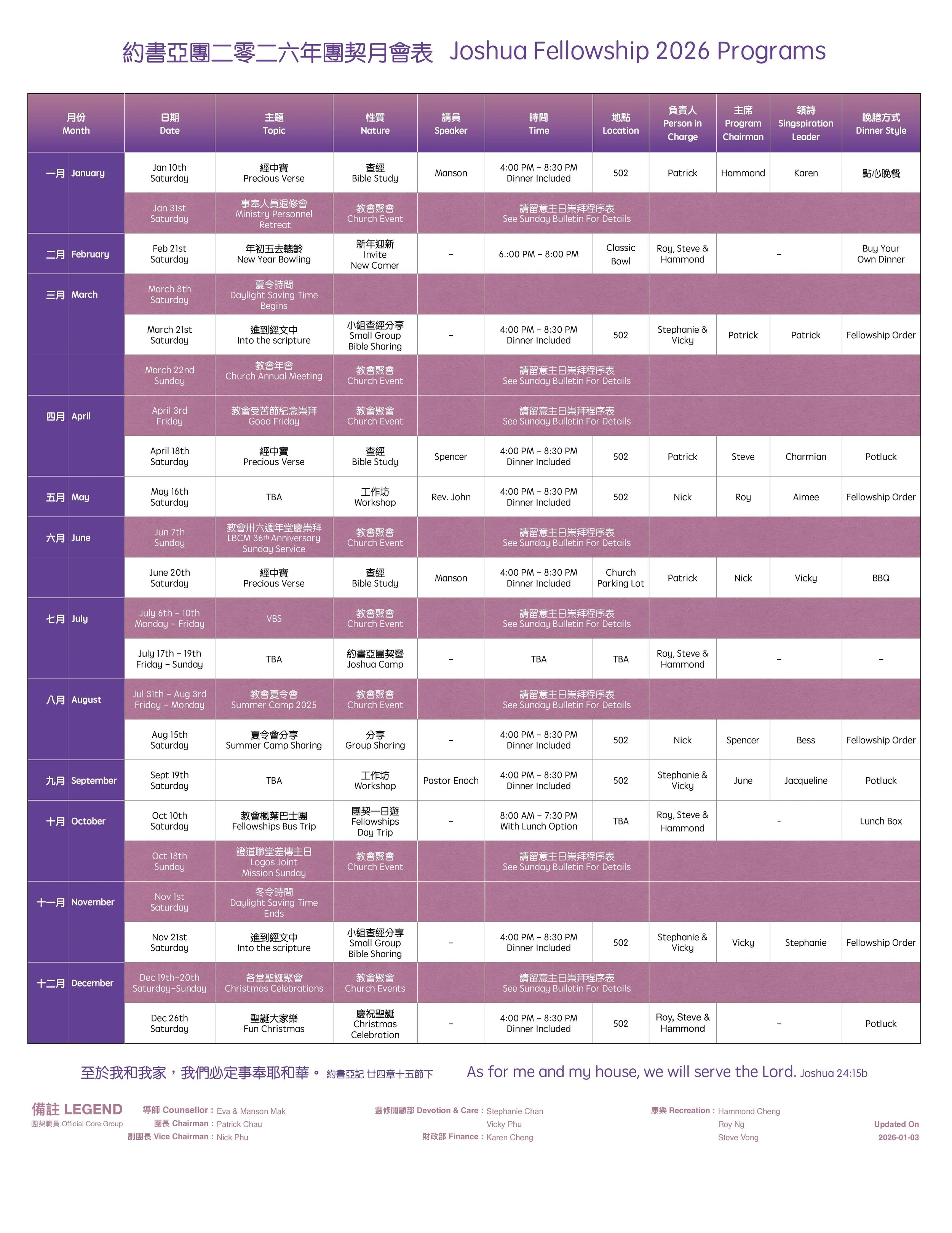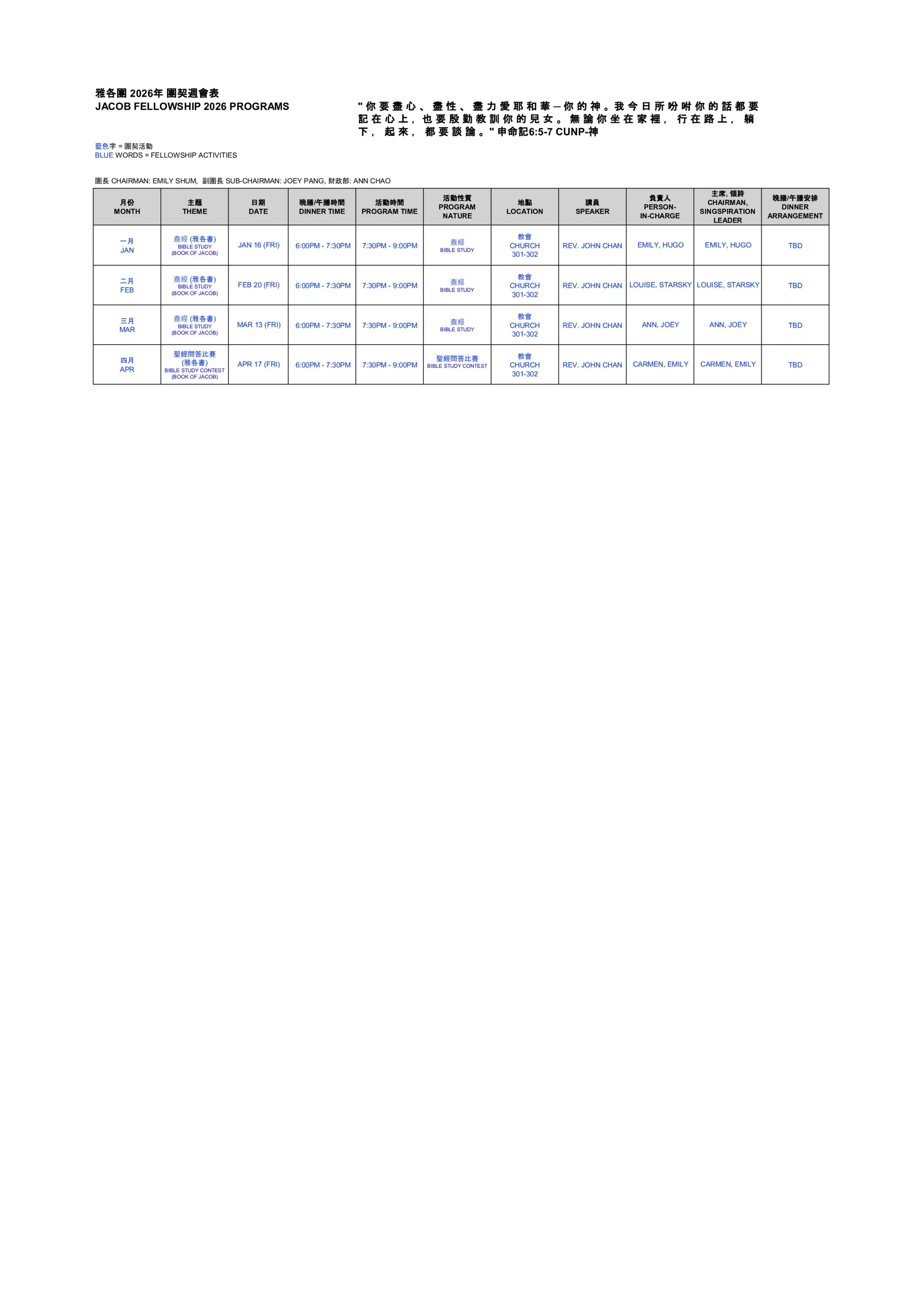 實體/網上團契聚會 歡迎慕道朋友, 並主內弟兄姊妹參加證道浸信會美城堂的聚會;願賜厚恩的主耶穌基督賜福與您及您的家人,希望您在我們教會能更多的認識神,讓證道浸信會美城堂成為您屬靈的家 。 團契聚會 約書亞團 (粵英語) 日期: 2月21日時間: 6:00PM主題: 年初五去轆齡地點: Classic Bowl聯絡: 周立德 @ 647-887-3331 保羅團(國語)時間: 7:00 PM主題: 地點: 502室聯絡: 傅濤牧師 @ 647-608-0688 保羅團契 雅各團 (粵語) 時間: 7:30PM主題: 查經 (雅各書)地點: Room 301-302聯絡: 岑劉智寶 @ 905-813-7007 以撒團 (粵語) 日期: 1月24日時間: 10:30 AM 主題: 生命揸fit人地點: 502室聯絡: 鄧考恩 @ 416-908-1256 挪亞團 (國語)日期: 每周五時間: 10:00AMMeeting ID: 870 8166 4976 Passcode: 985726聯絡: 馬英雲 @ 905-826-9869 挪亞團契 摩西長青團 (粵語) 時間: 每月第三個週六 2:00 PM主題: 詩歌、信息地點: 加樂樓聯絡: 郭志堅 @ 289-440-2319